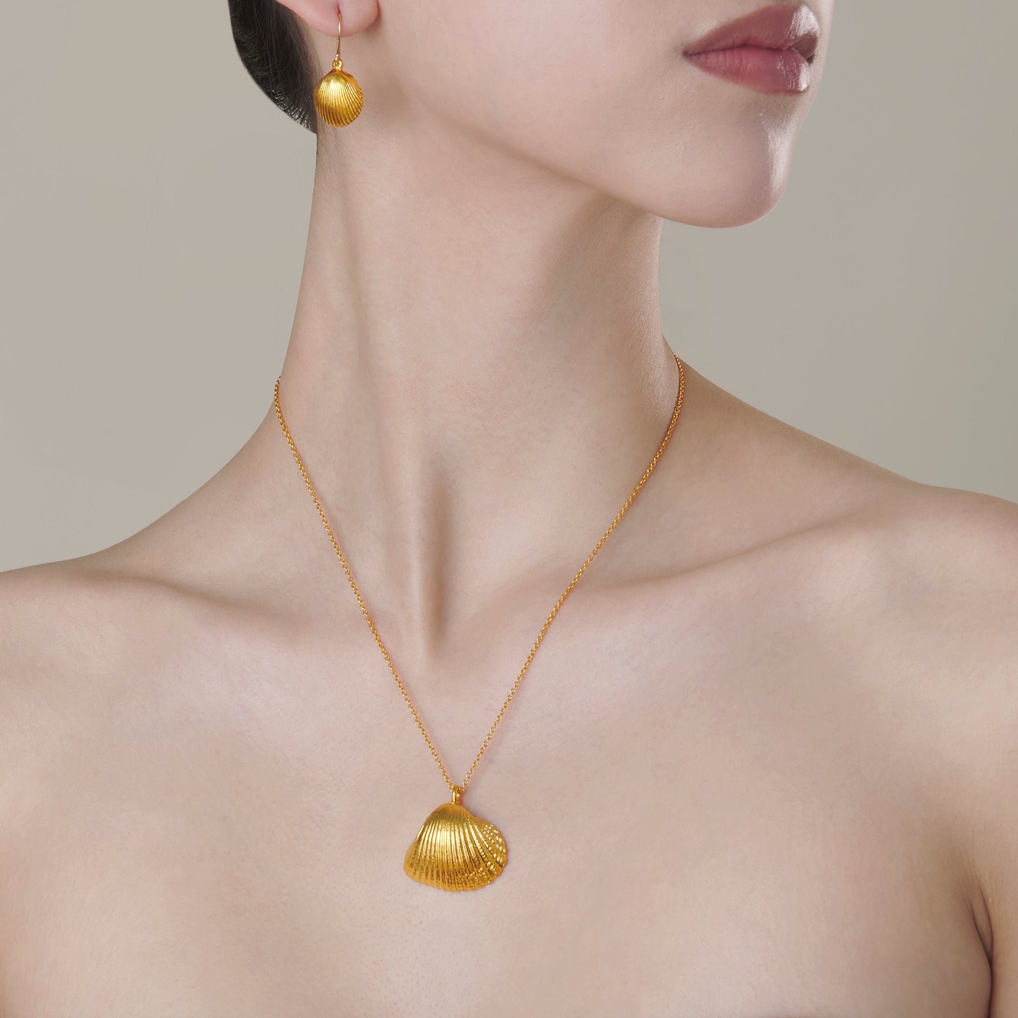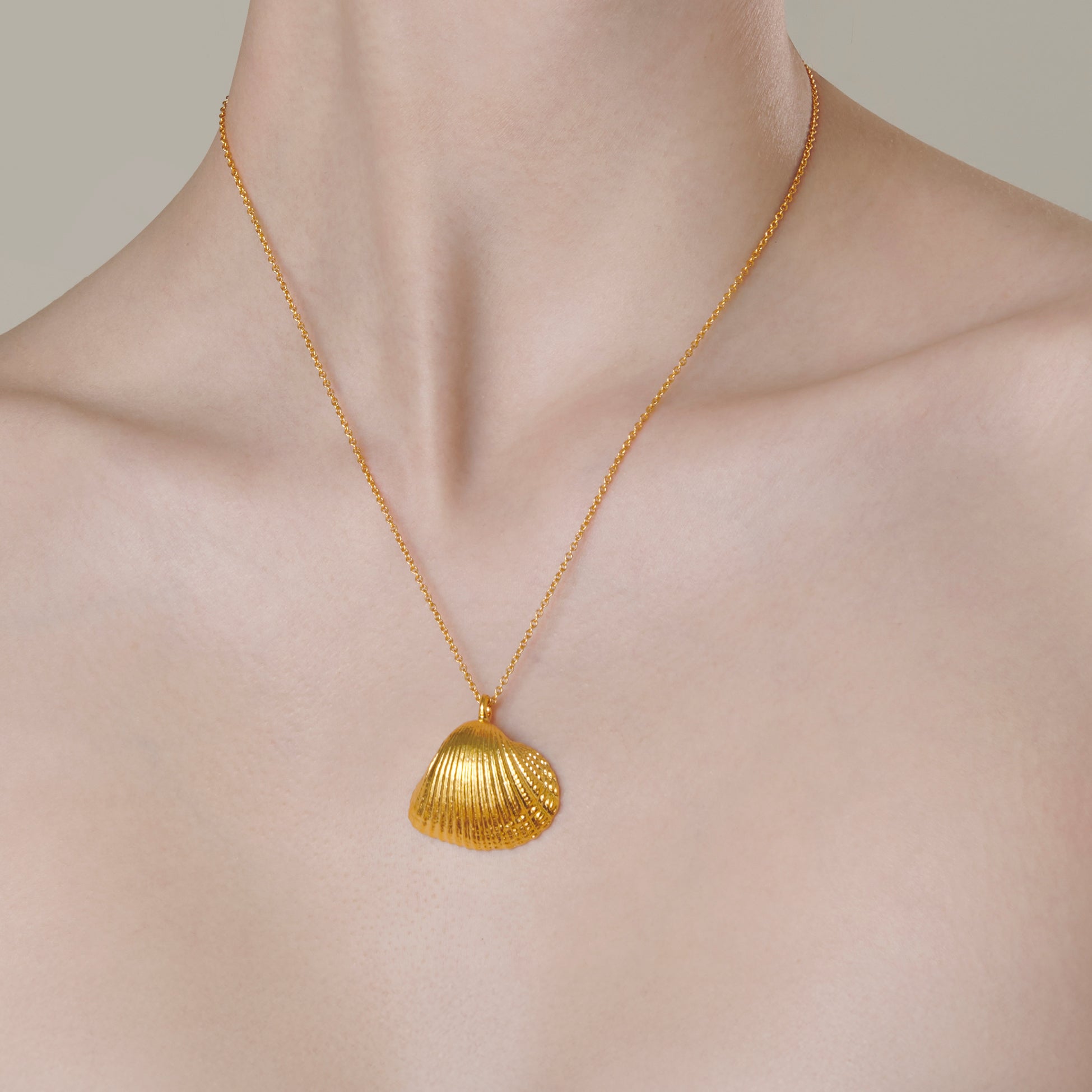 A sculptural tribute to the sea’s quiet treasures. Cast in 24k gold, the Clam Pendant captures the graceful curves and ridged texture of a naturally closed shell.