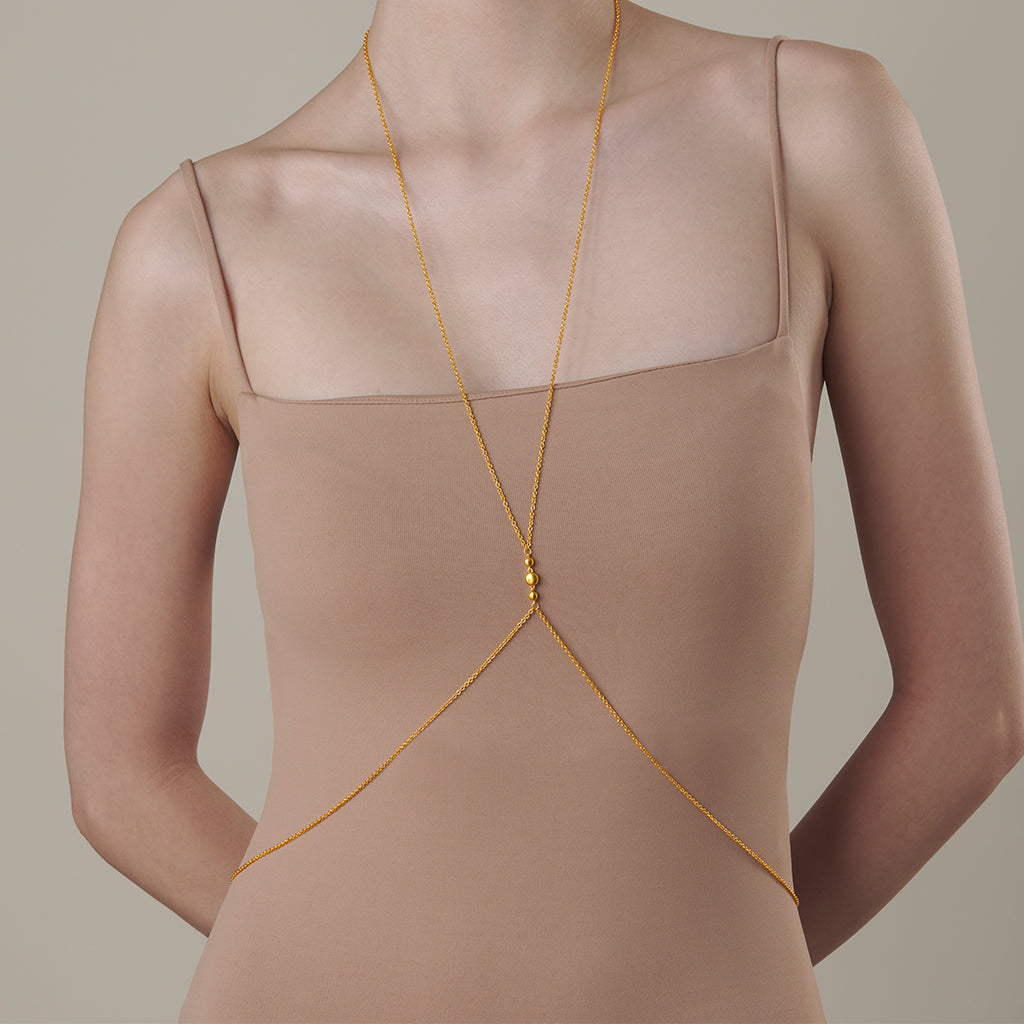 A bold yet minimalist gesture. Crafted from our signature classic chain, the body chain drapes fluidly across the torso in 24k gold, adding golden architecture to bare skin or styled silhouettes.