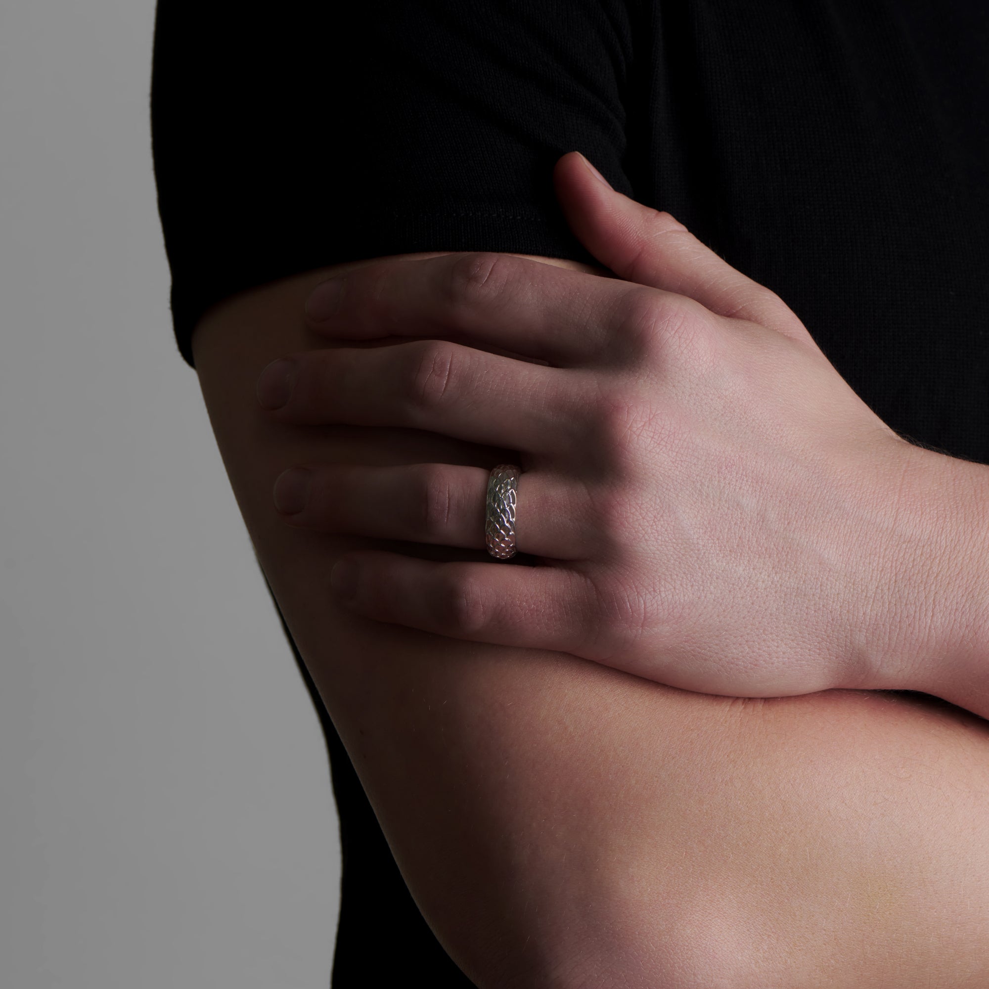 The Dragonscale Ring, a bold statement piece inspired by the mythical power of dragons. Crafted in pure platinum, the intricate scale design wraps around your finger, symbolizing protection, resilience, and timeless beauty.