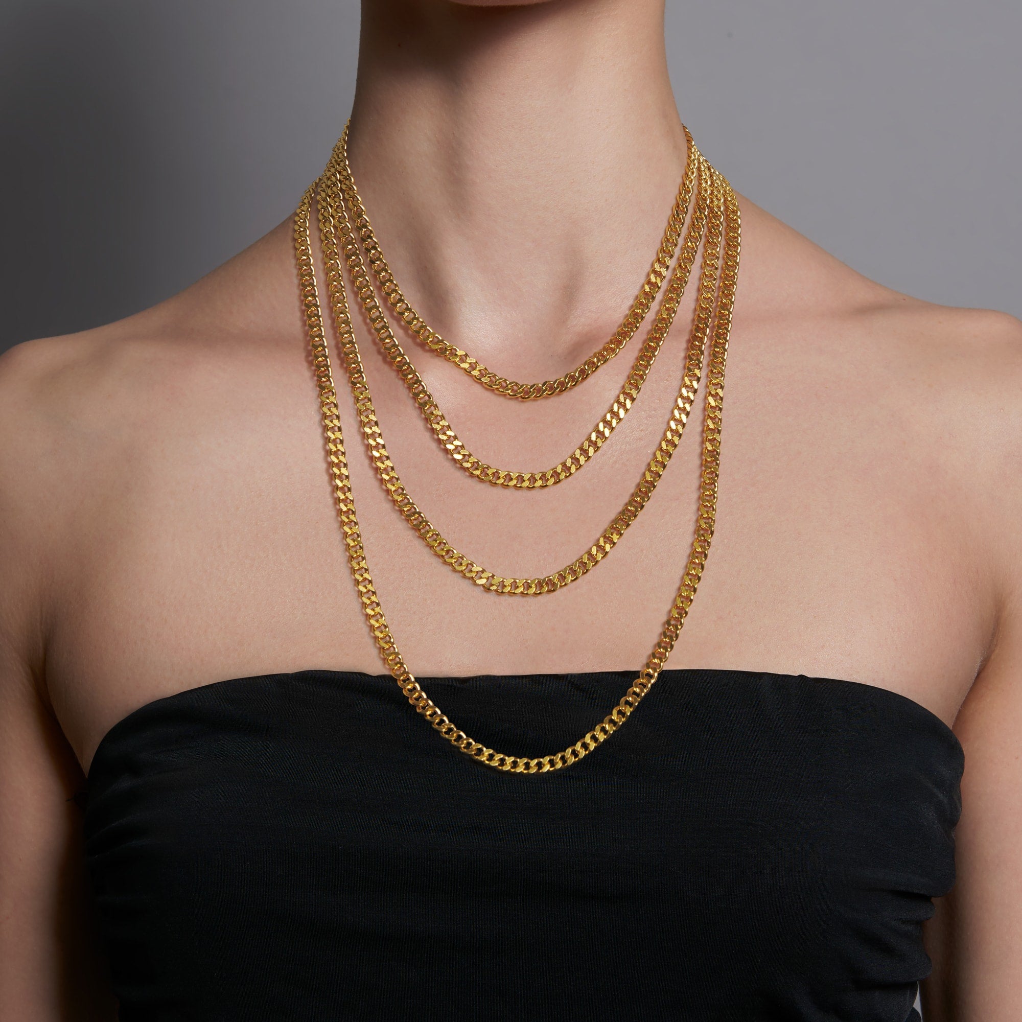 A masterpiece of gold craftsmanship, our 24k gold Flat Curb Chain unites unparalleled movement and style with the brilliance of pure precious metal. Formed with smooth, flattened round links, this chain exudes the splendor and luxury of 24k gold.