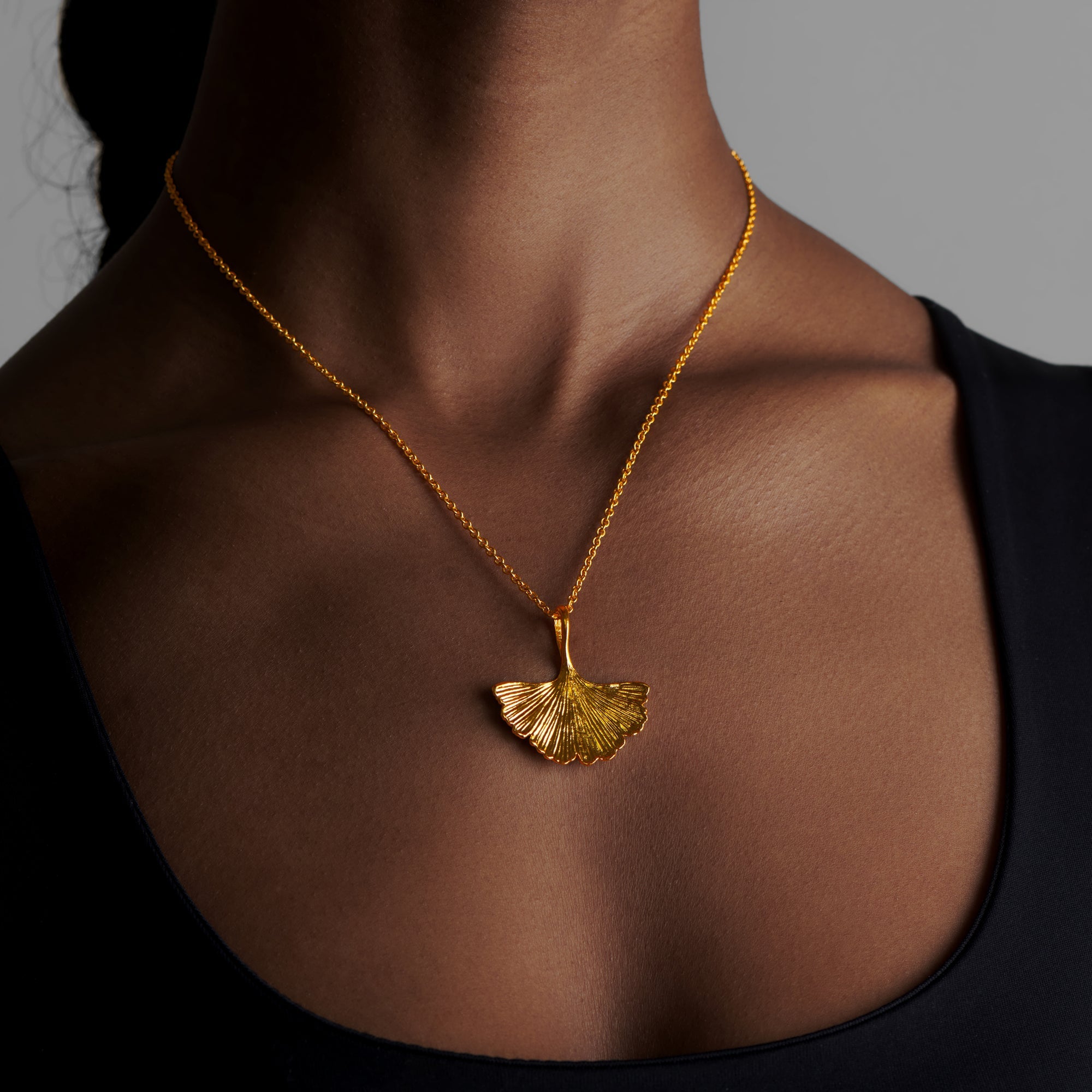 The 24k gold Ginkgo Leaf Pendant forms a bold, graceful silhouette. With its exquisite detailing, this emblem of resilience shines from every angle.Creates a captivating set with the Ginkgo Leaf Ring.