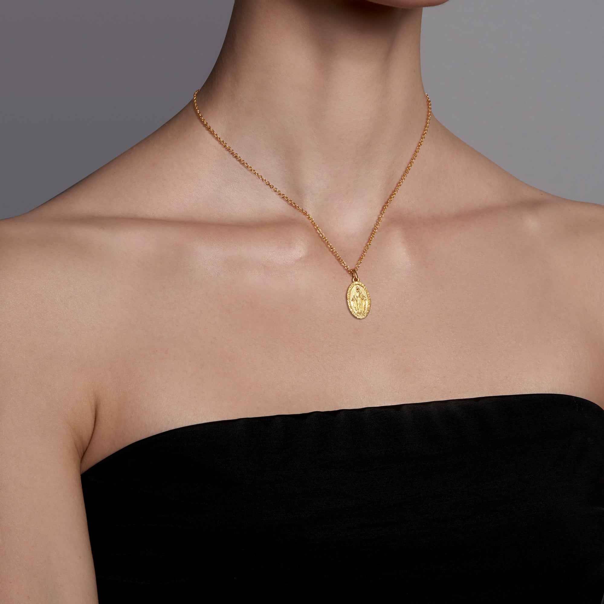 “All who wear it will receive great graces,” promised Our Lady when she detailed the design for this “Miraculous Medal”. Grace your neck and enter into an ageless tradition when you wear this 24k gold pendant of Mary, the Mother of God.