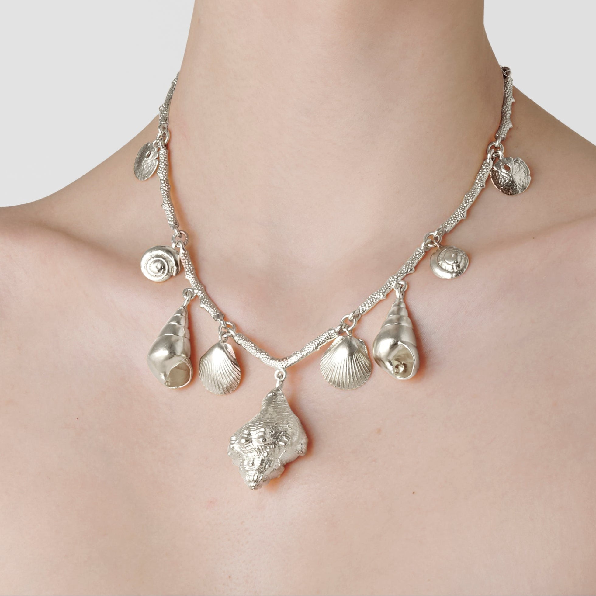 A chorus of shells, sculpted in pure platinum. The Multi Shell Necklace gathers the ocean’s whispers with each curve and ridge a fragment of tide and time. Worn together, they form a luminous hymn to nature’s quiet elegance.