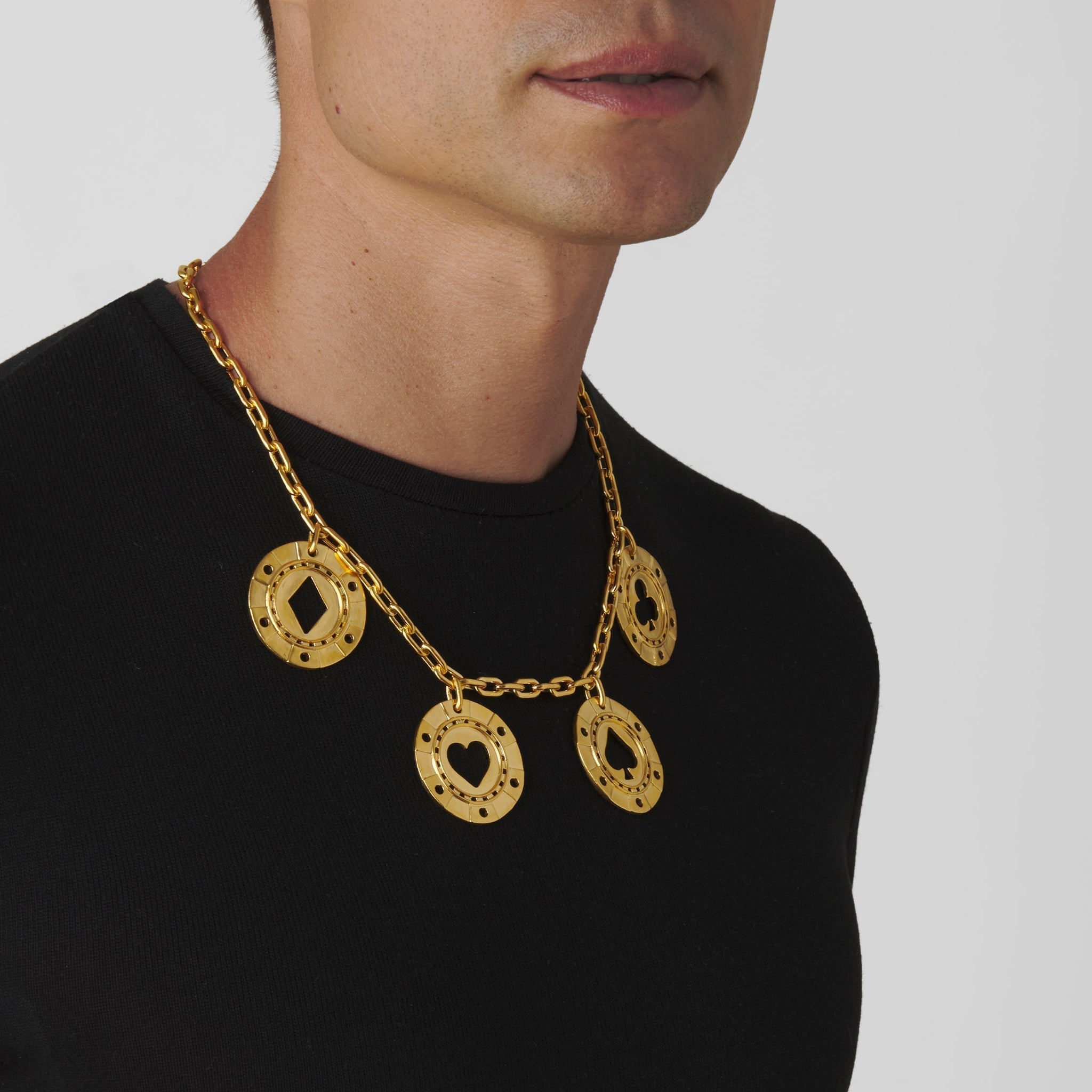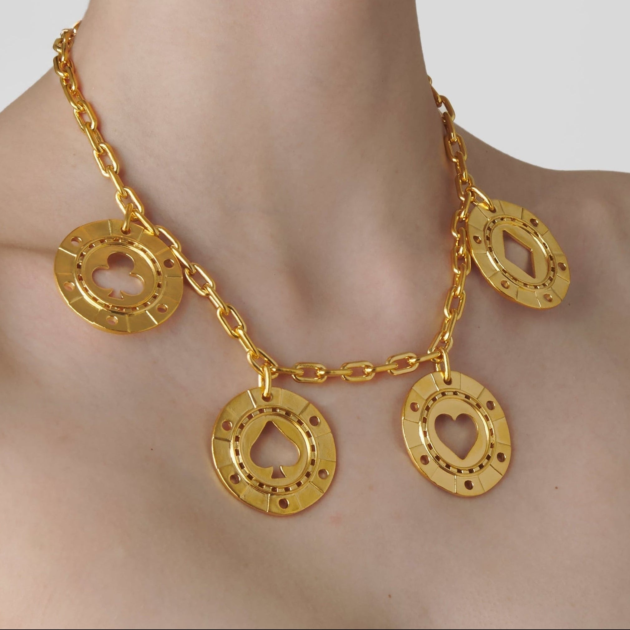 A circle of chance, cast in gold. The Poker Chip Necklace carries the thrill of the game, turning risk into a luminous keepsake.