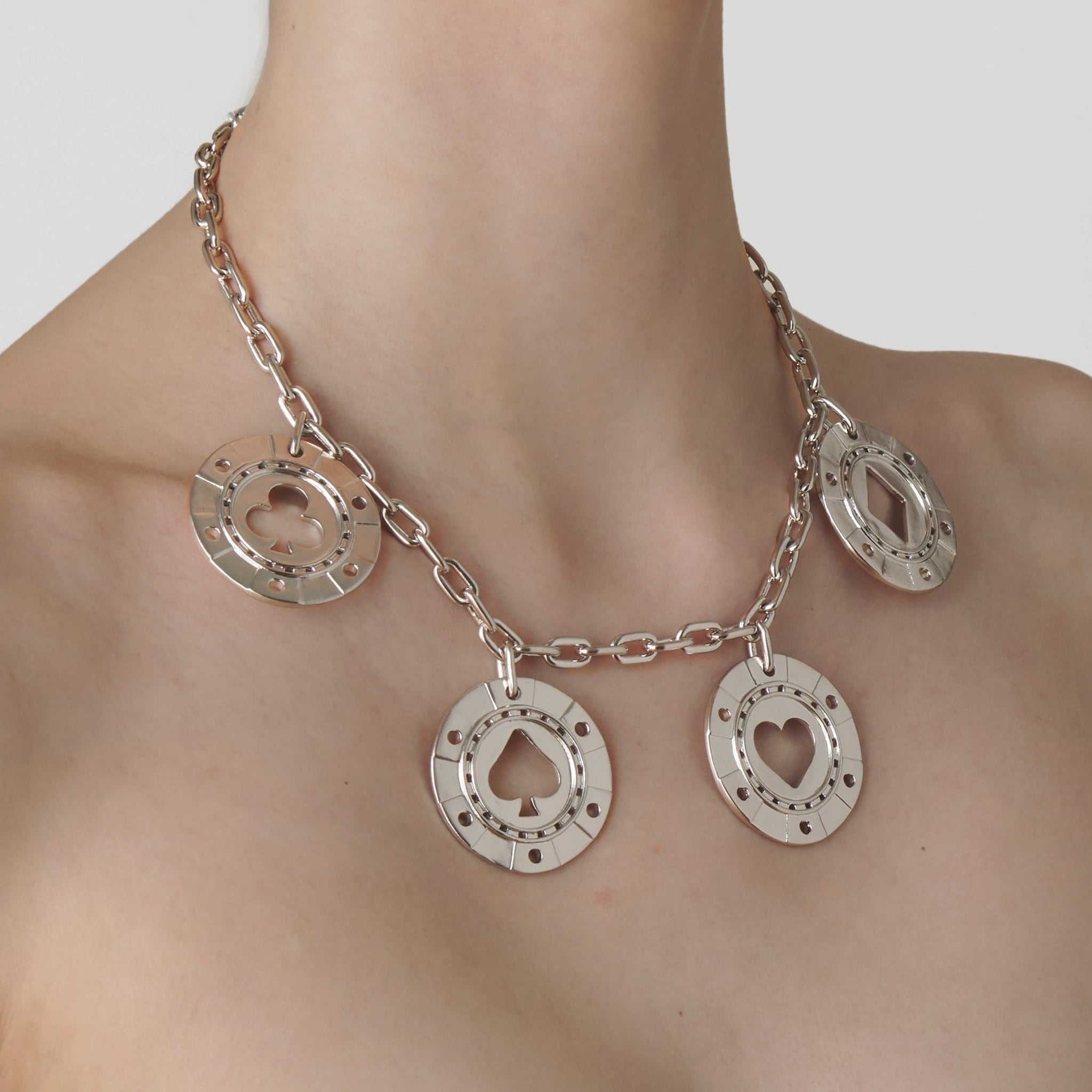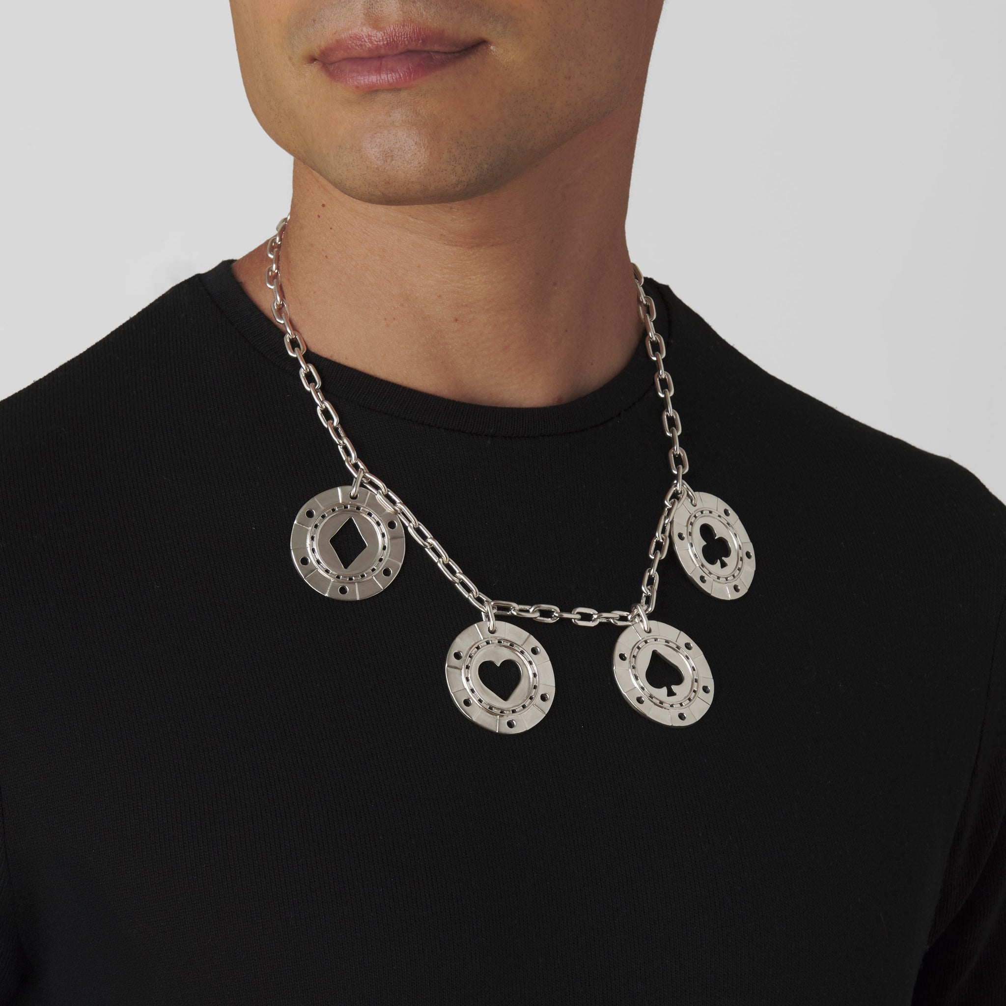 A circle of chance, forged in platinum. The Poker Chip Necklace carries the thrill of the game with cool brilliance and enduring presence.