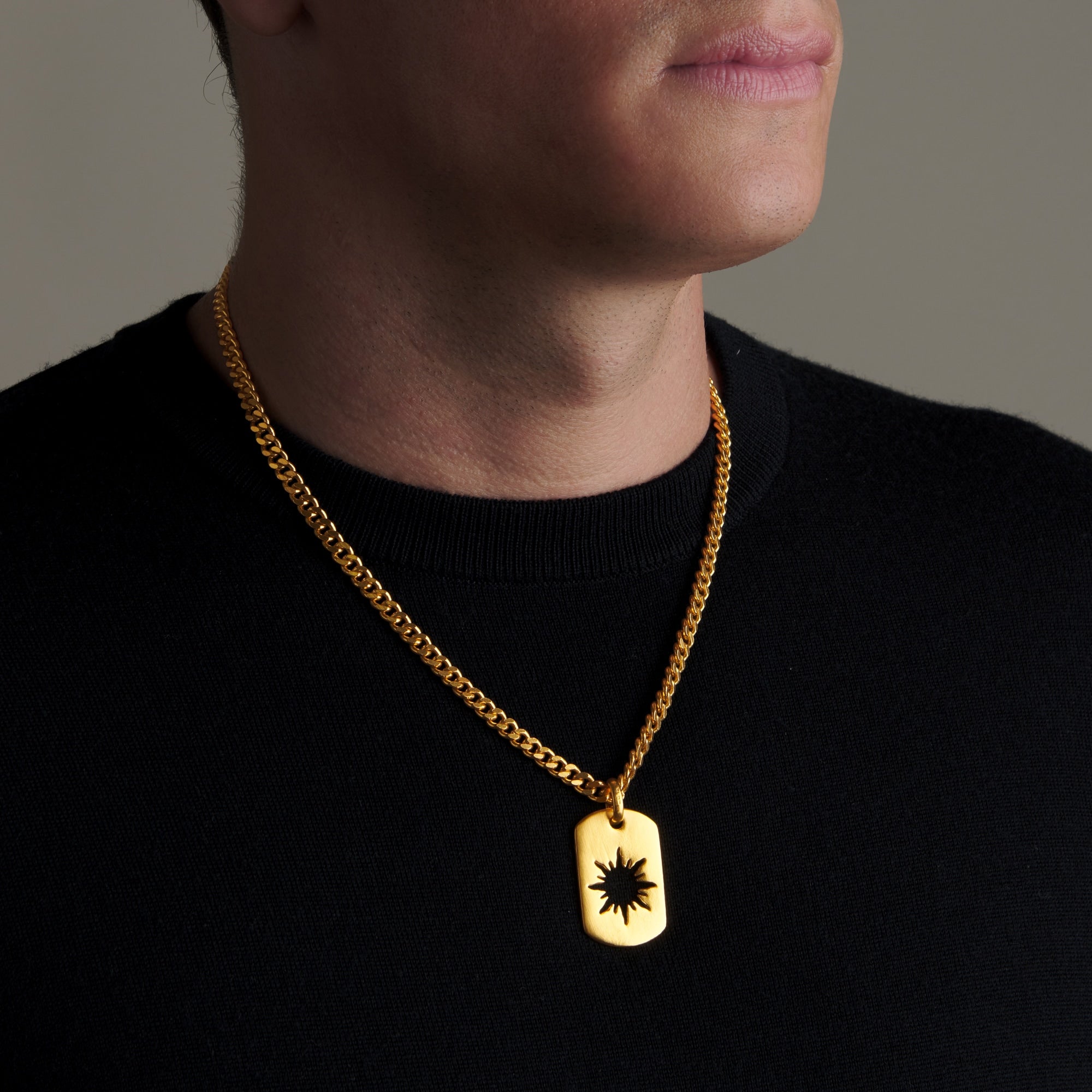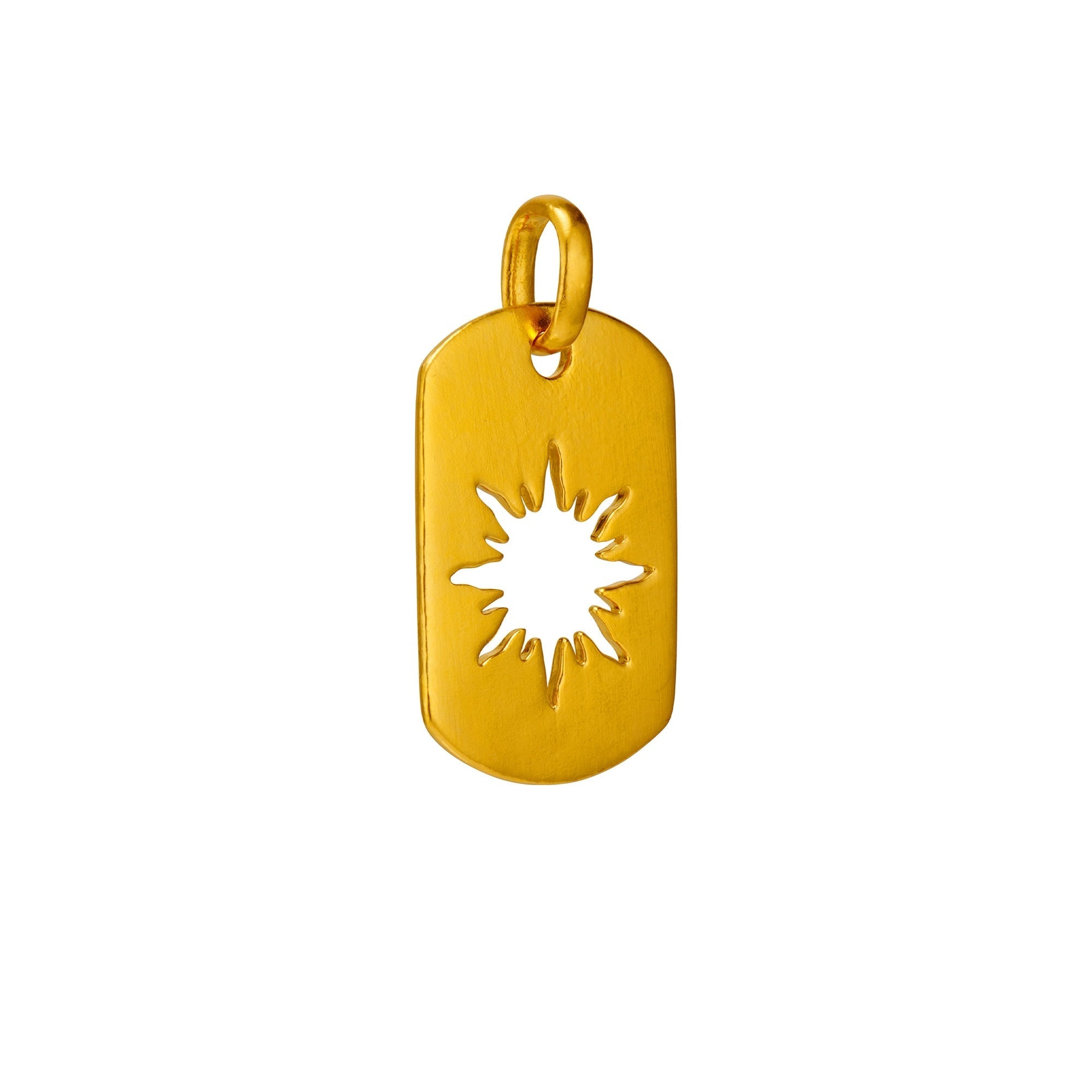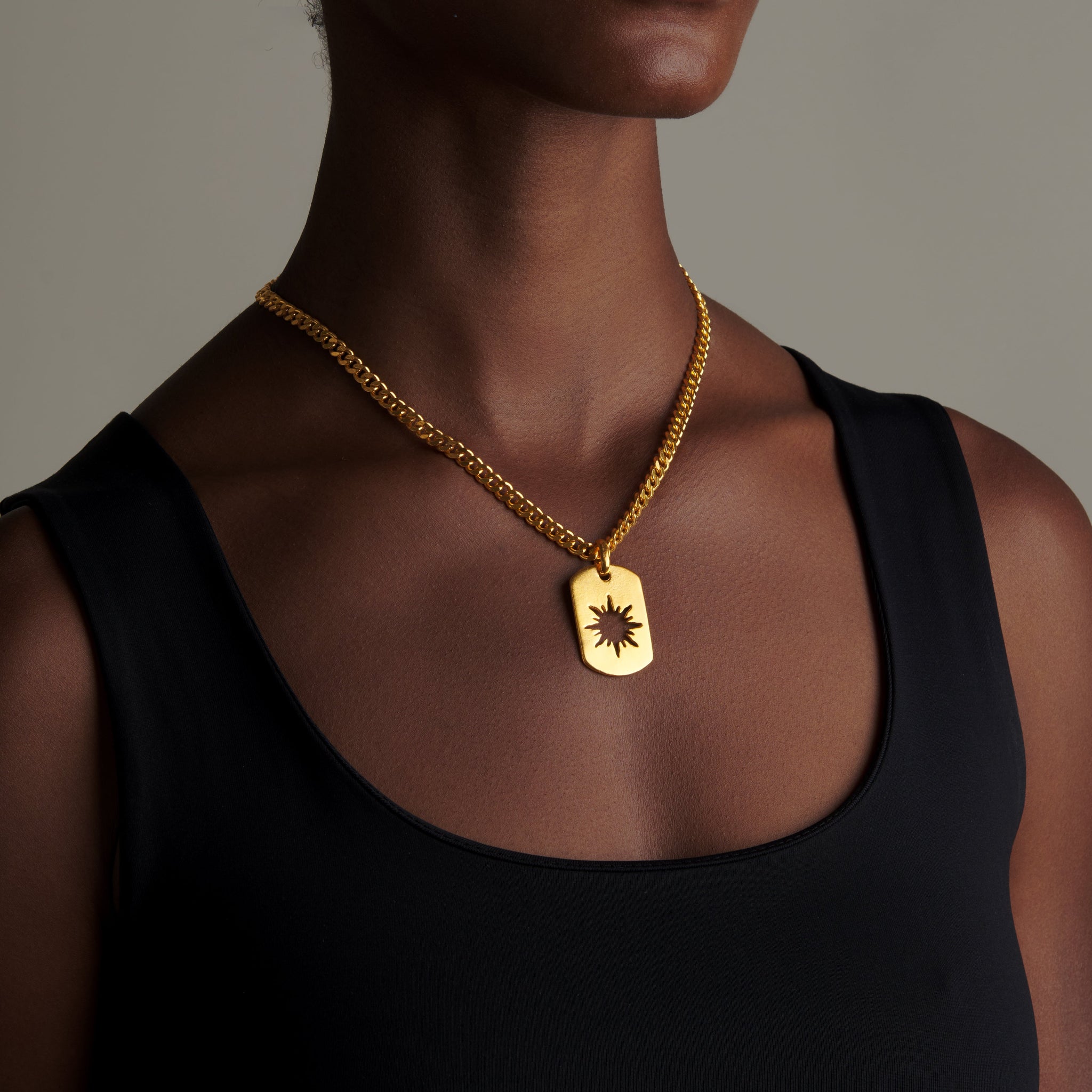 The Sun Tag in 24k gold combines the rugged charm of a dog tag with the radiant symbolism of the sun, evoking energy, positivity, and life.