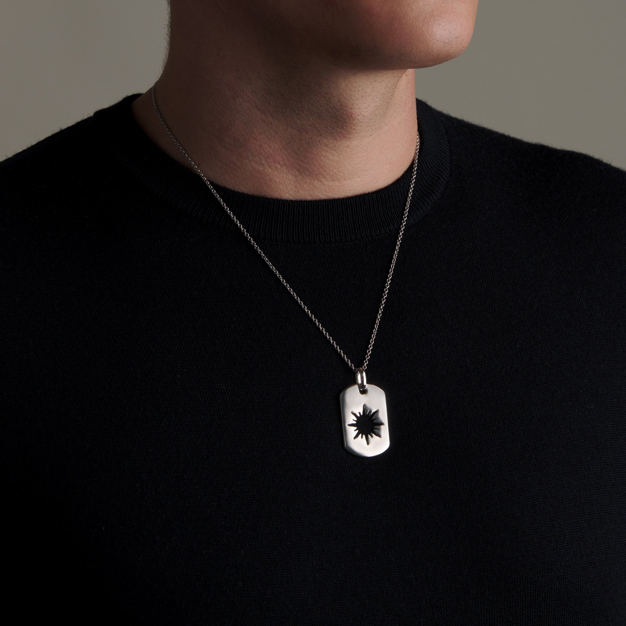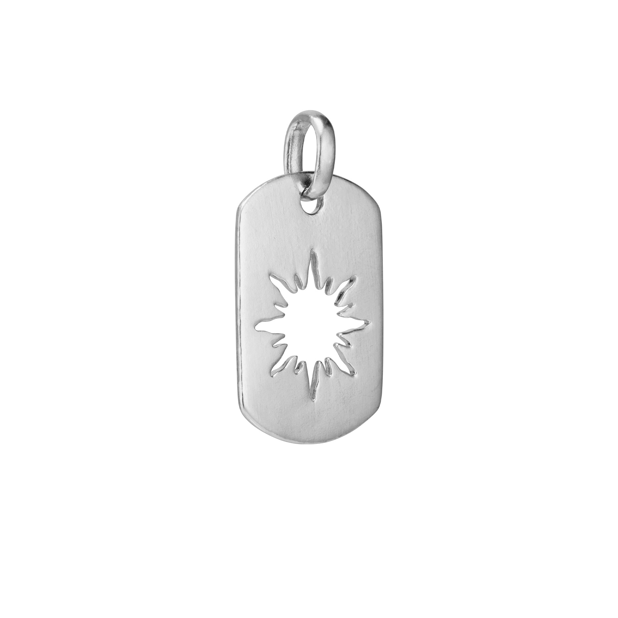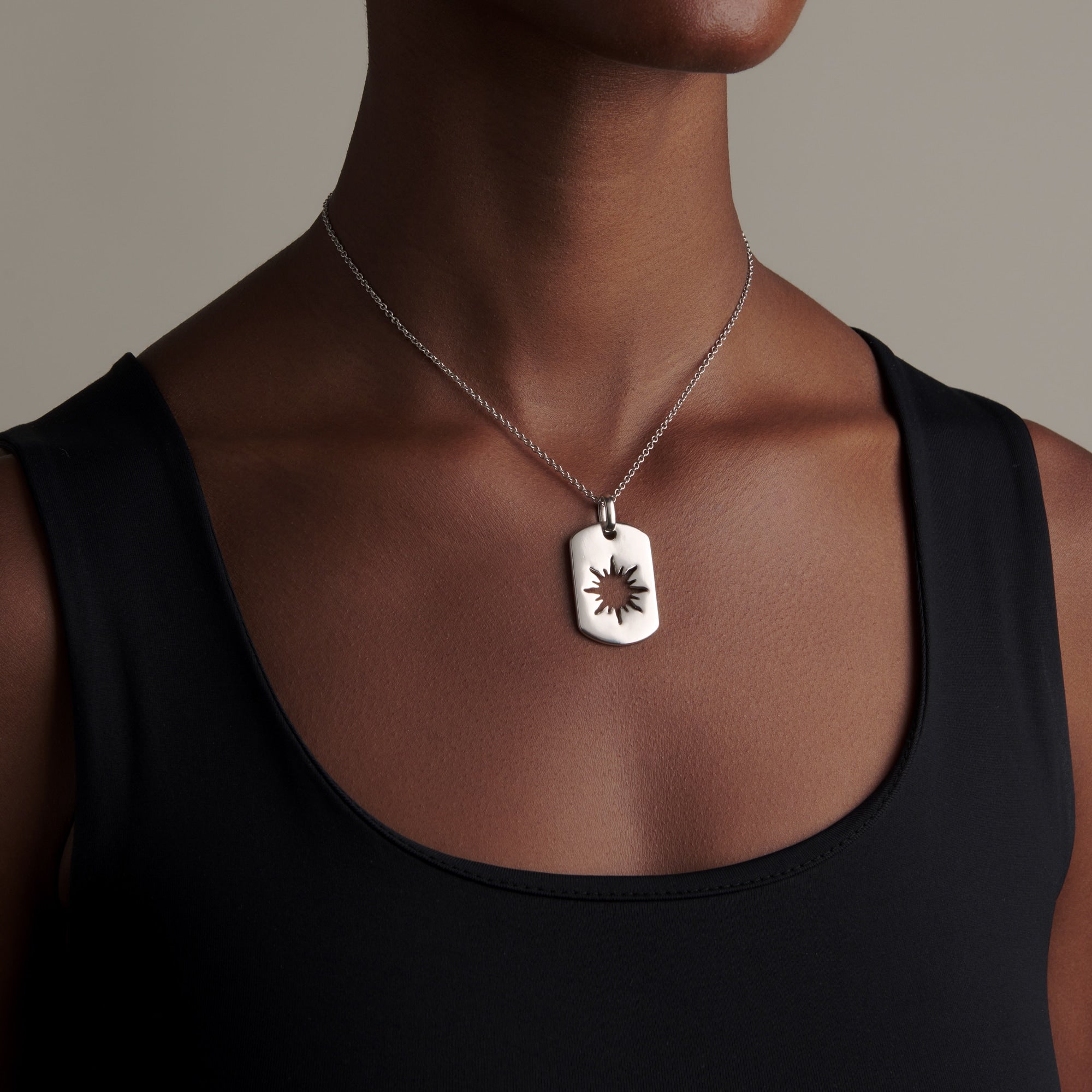 The Sun Tag in pure platinum combines the rugged charm of a dog tag with the radiant symbolism of the sun, evoking energy, positivity, and life.