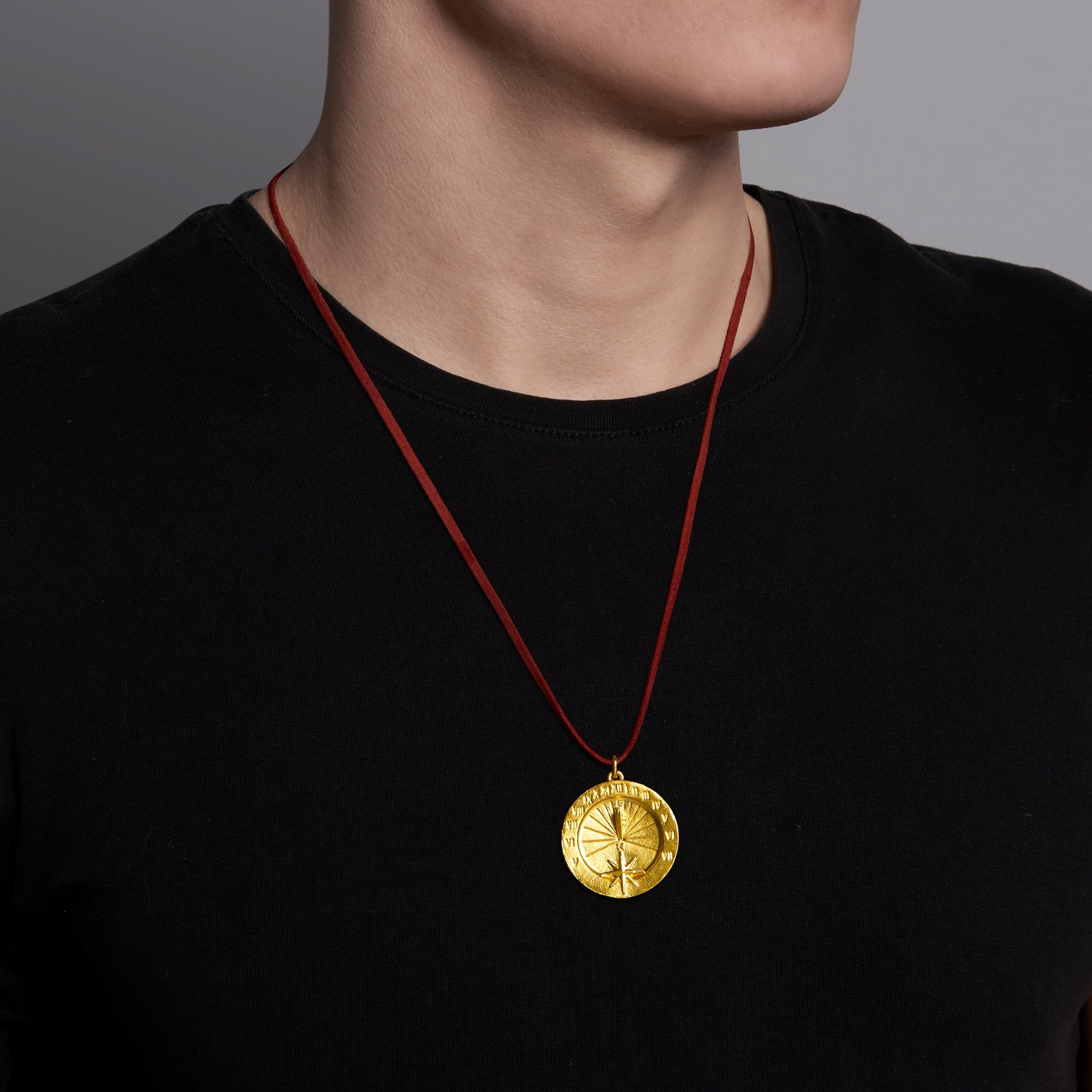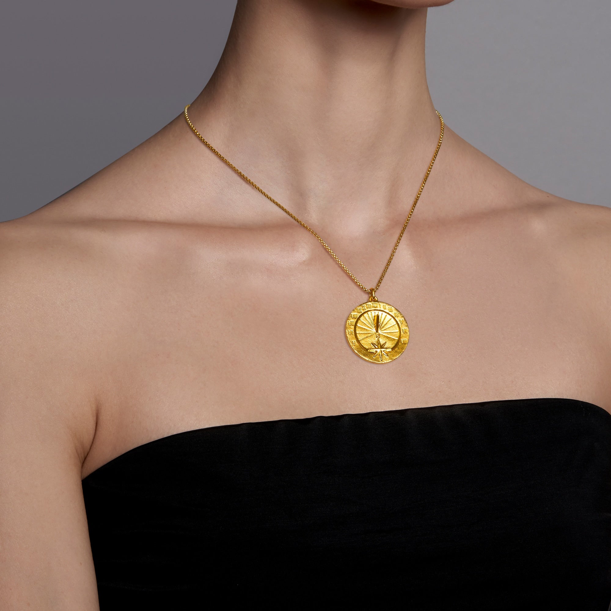 Attune your modern mind to more ancient wavelengths with the Sundial Medallion. This classic pendant illuminates the mysteries of time in radiant 24k gold. Available in 5 latitudes.