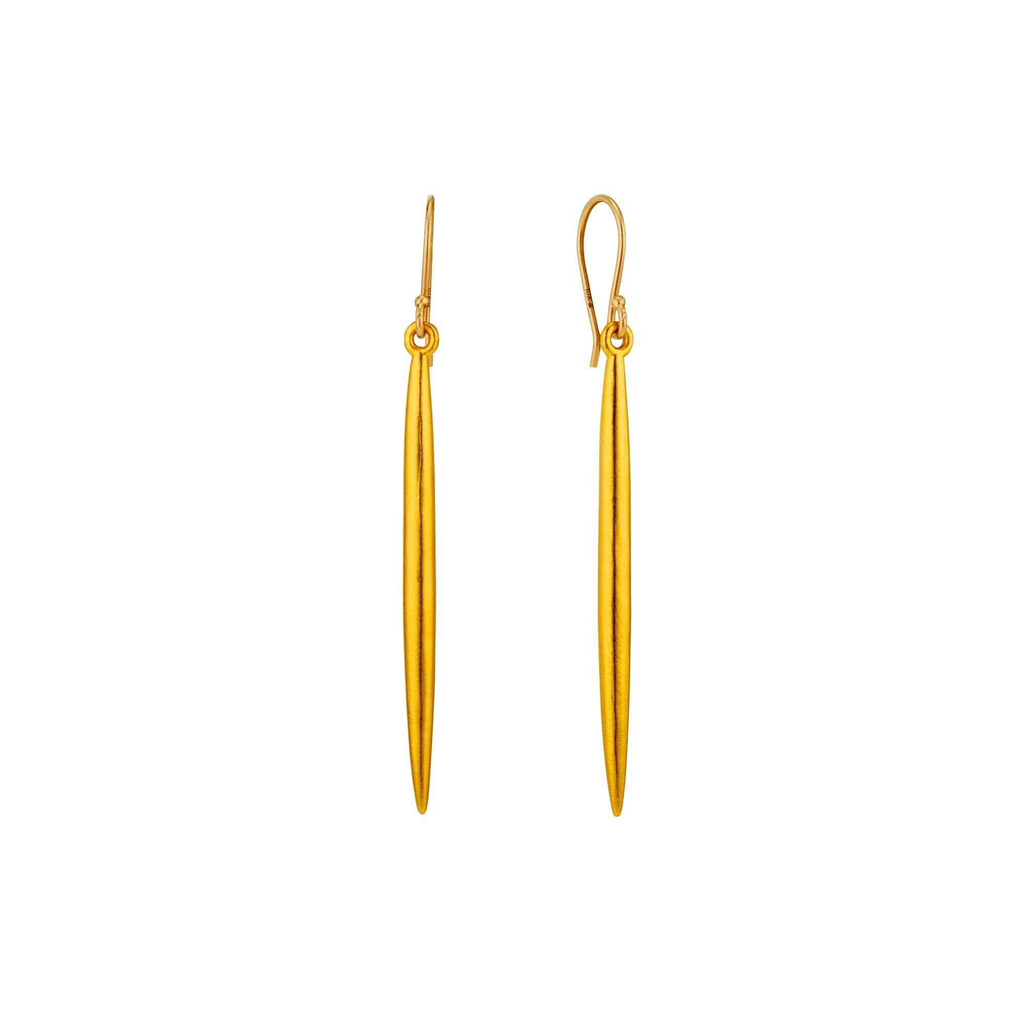 The 24k gold Tapered Drop Earrings are essential to any contemporary collection. Slender cylinders of luminous gold sway with grace and refinement to create a dynamic look.