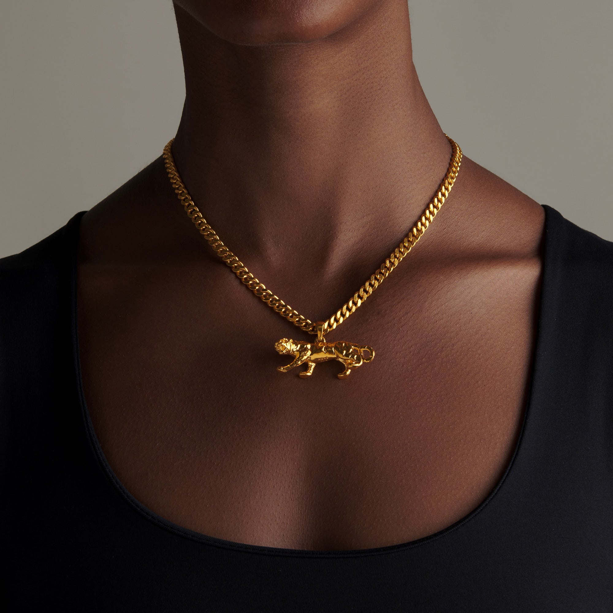 The striking Tiger Pendant in 24k gold captures the majestic essence of the tiger, symbolizing strength, courage, and resilience. Embrace the spirit of the wild and unleash your inner power.