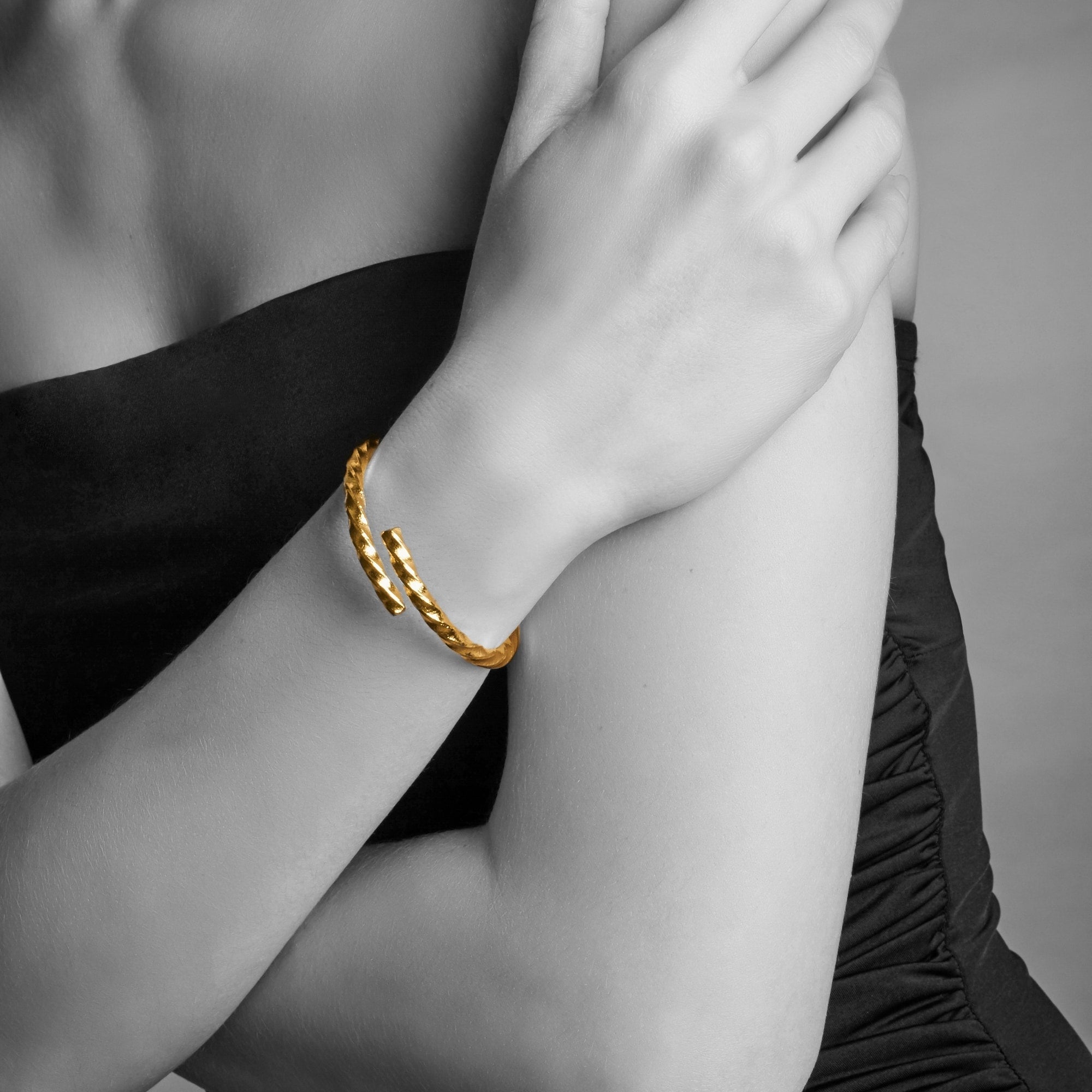 The Menē Torc exudes an ancient and unknown energy that must be experienced. Inspired by ancient designs from the bronze age, this solid gold bracelet embraces the purity and softness of 24k.