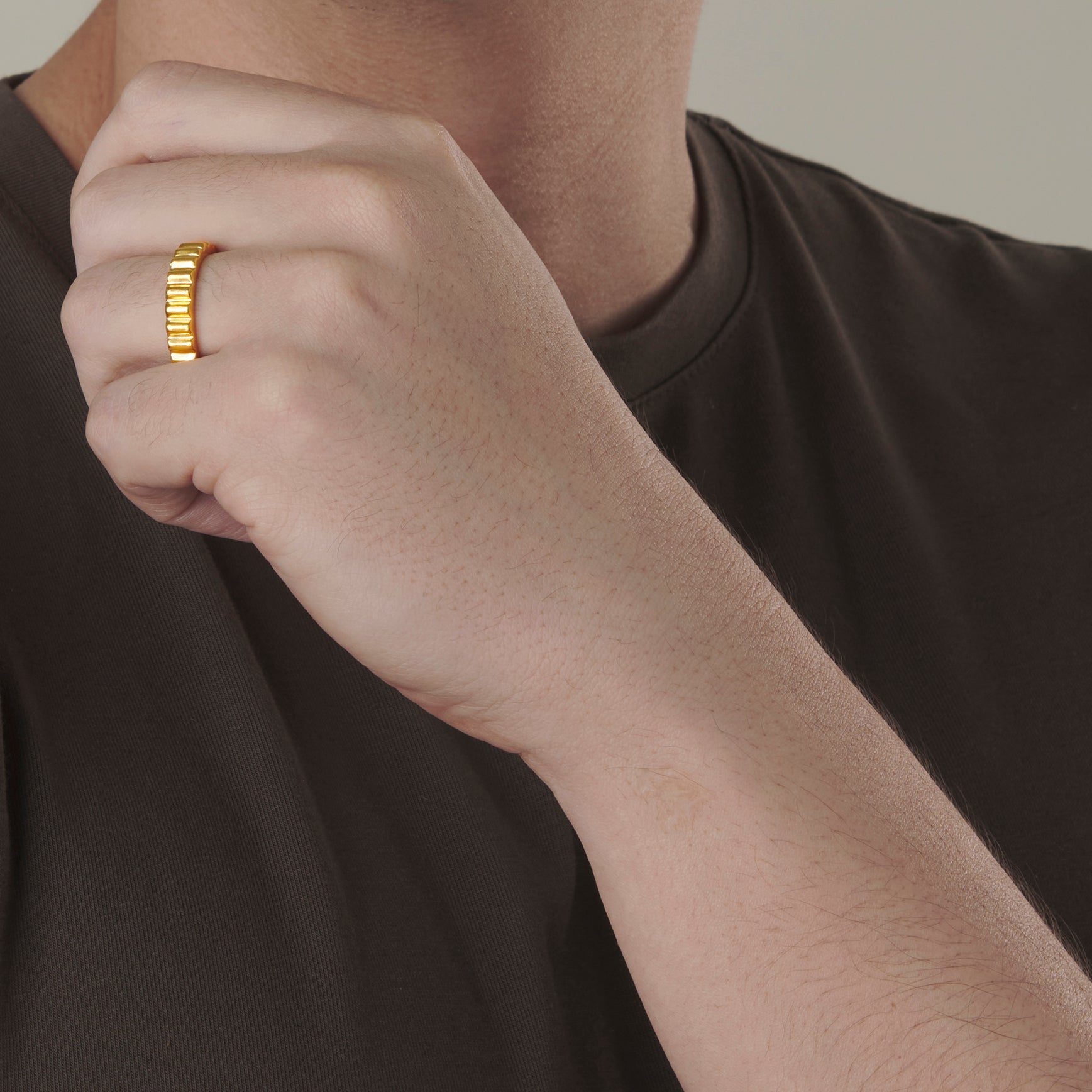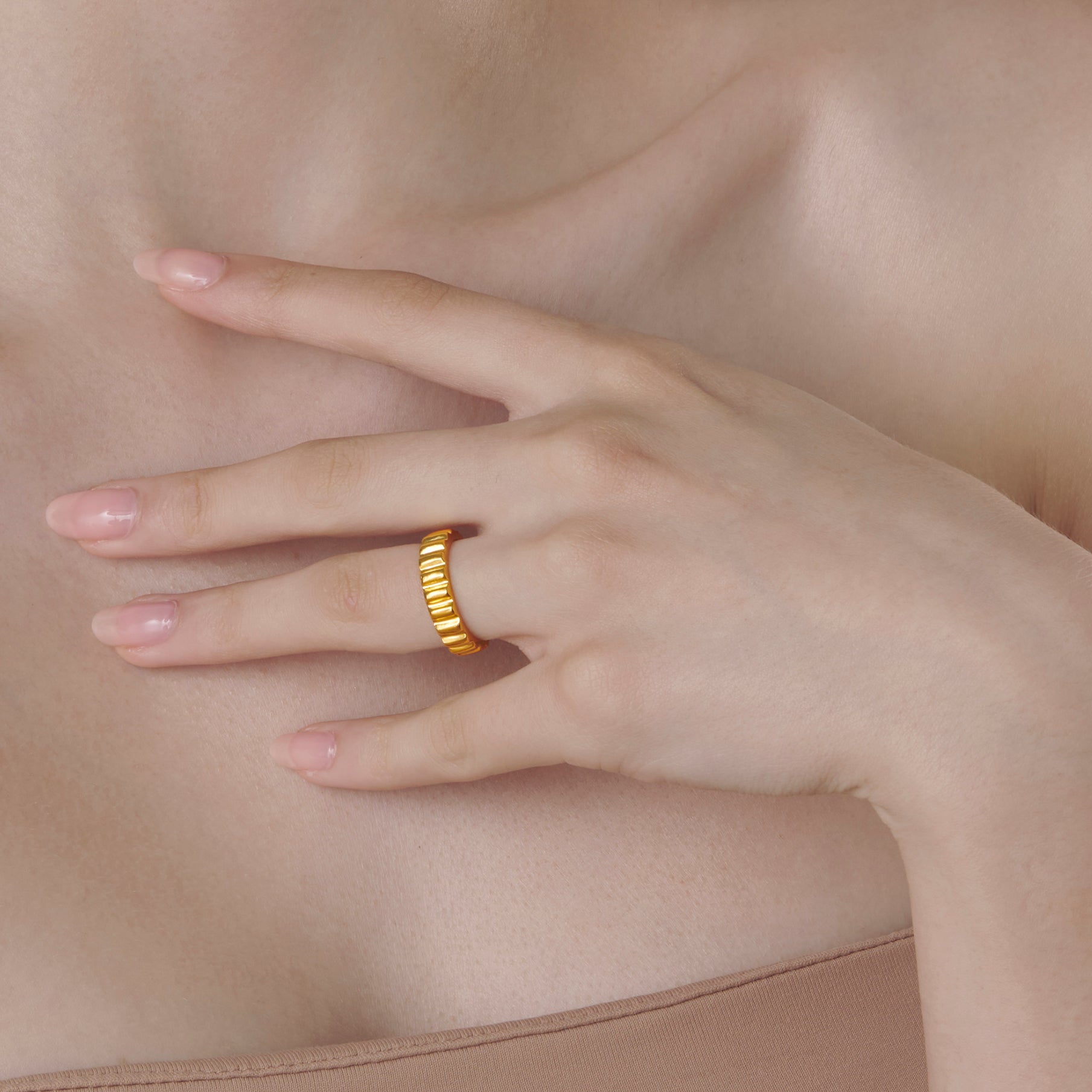 Engineered elegance. The Wide Axis Band channels modernity through a continuous ridged pattern, clean, directional, and grounded in 24k gold.