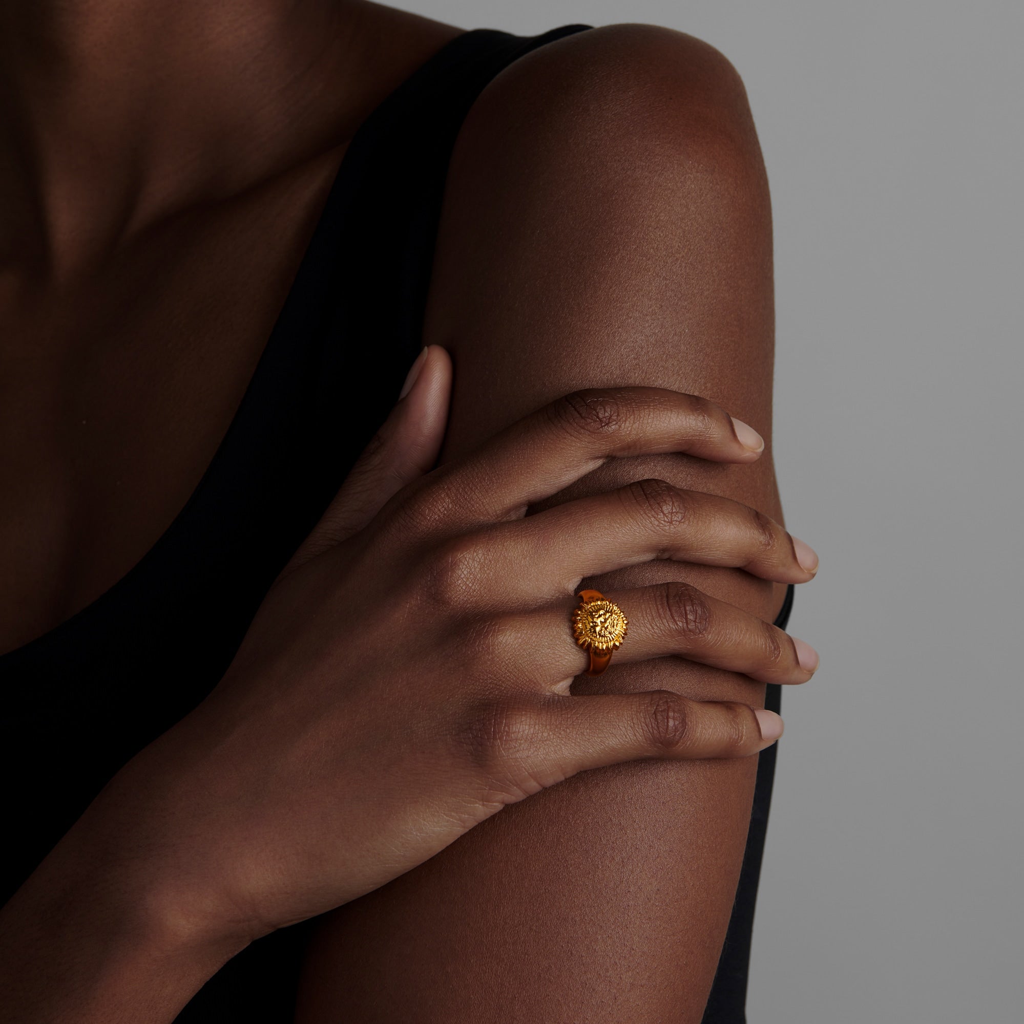 Wrought from gleaming 24k gold, the Zeus Ring is the epitome of the king of gods. A bold and striking piece, this ring captures the raw power of Zeus.